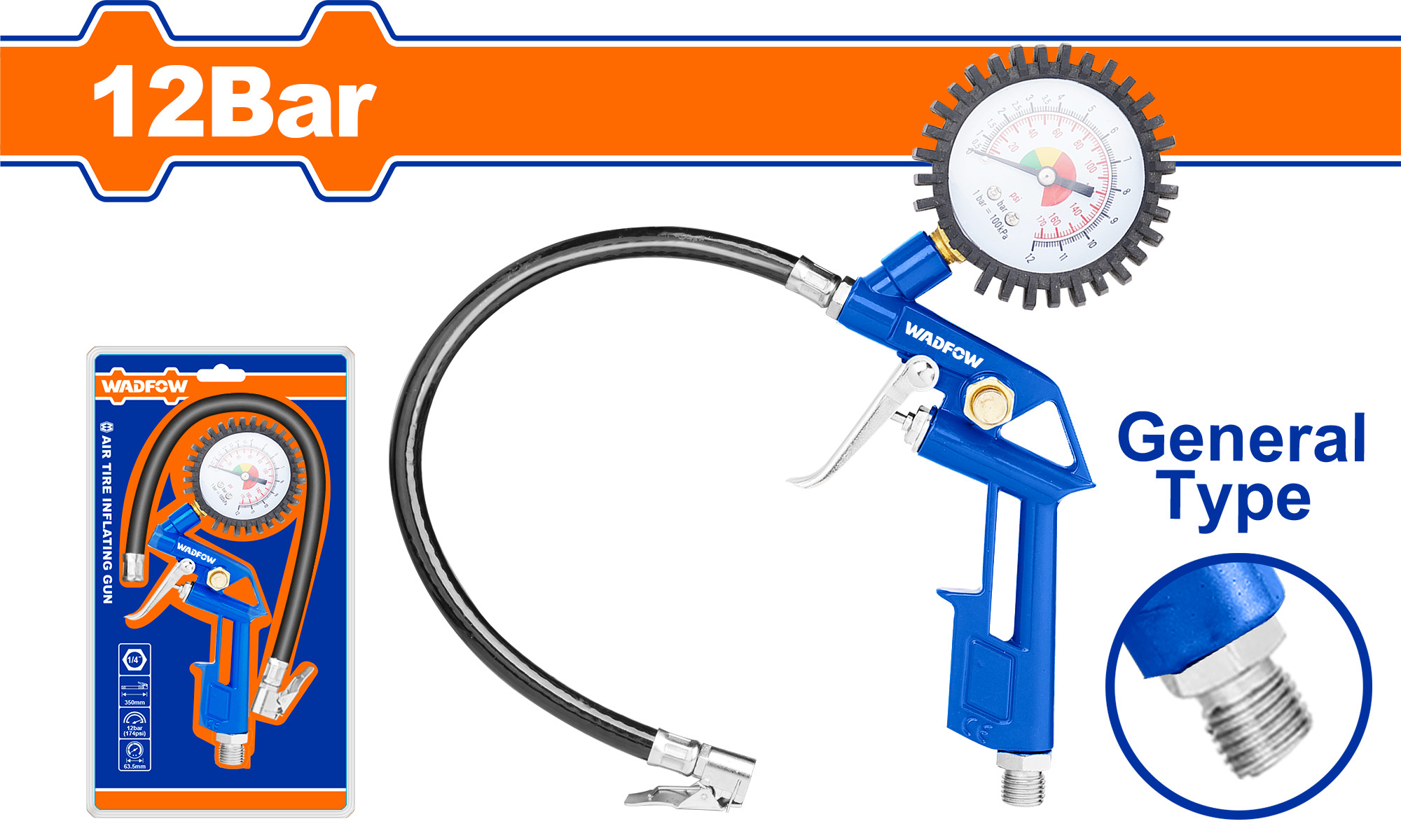 Bơm bánh xe (súng-có đồng hồ) WADFOW WGA2612 : là đối tác không thể thiếu để đảm bảo an toàn khi lưu thông. Với tính năng kiểm tra áp suất đáng tin cậy, sản phẩm này giúp bạn bảo đảm lốp xe luôn trong tình trạng an toàn.