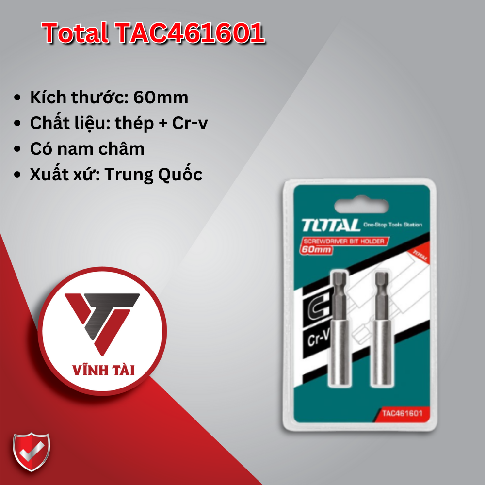 Đầu nối lục giác Total TAC461601 được làm từ thép CR-V không gỉ sét, có nam châm hỗ trợ anh em bắt nối vít rất tiện lợi hơn