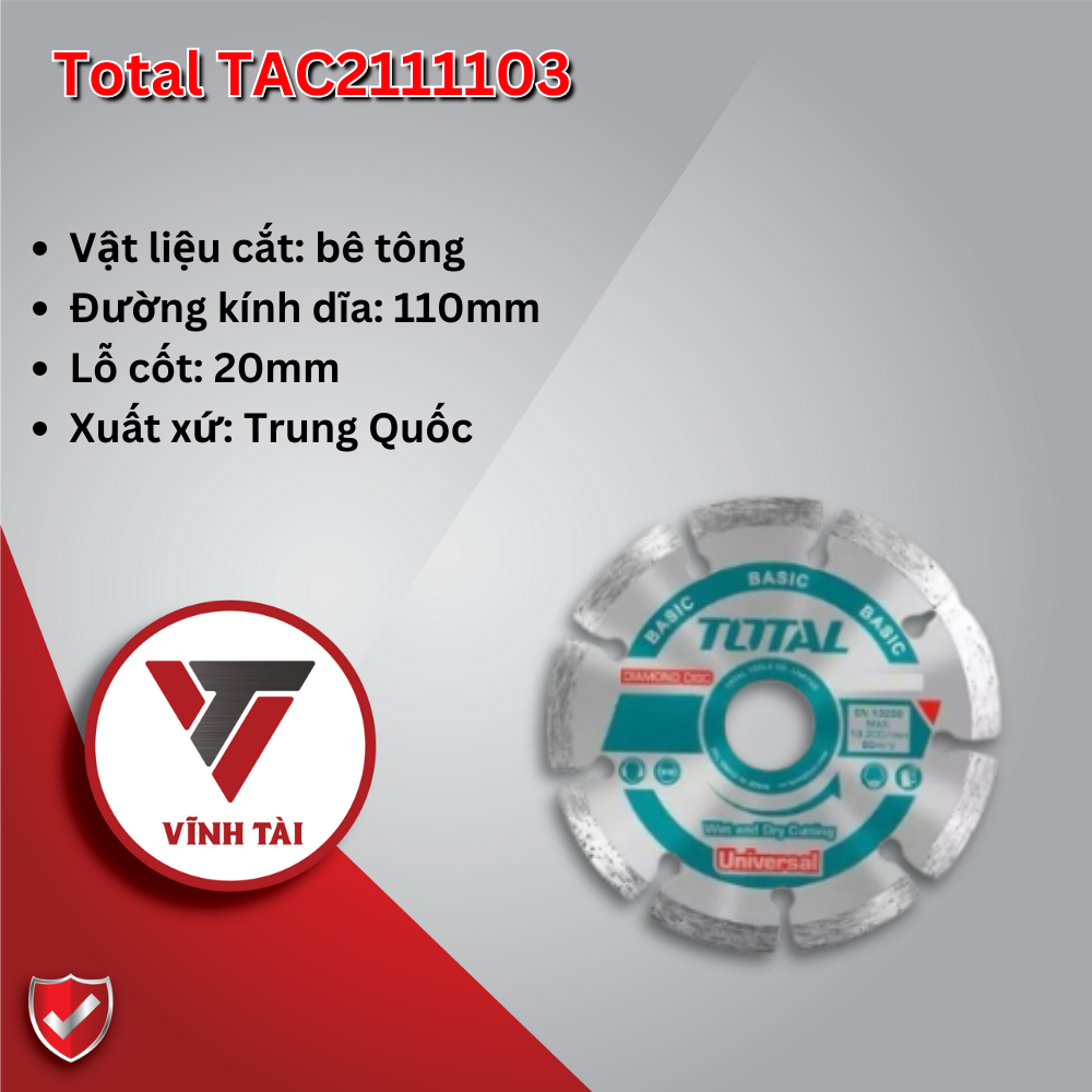 Dĩa cắt bê tông 110mm Total TAC2111103 là phụ kiện dùng trong xử lý các vật liệu cứng như đá hoa cương và đá tự nhiên. Các phân đoạn cắt kim cương không qua xử lý nung kết. Sản phẩm thích hợp với máy cắt, cụ thể là máy cắt bê tông cầm tay