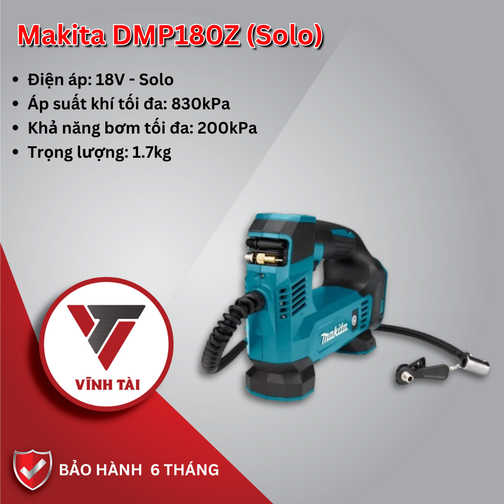 Máy bơm hơi Pin 18V Makita DMP180Z: là Máy bơm hơi sử dụng bằng pin, sp mới cực kì độc đáo của makita. Khả năng bơm tối đa 10L/phút.