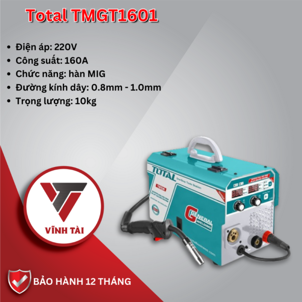 Total TMGT1601 có công suất làm việc mạnh với nguồn đầu ra lên đến 160A, hàn tốt với dây hàn có đường kính 0.8mm – 1.0mm, hiệu suất chu kỳ làm việc đạt 60%