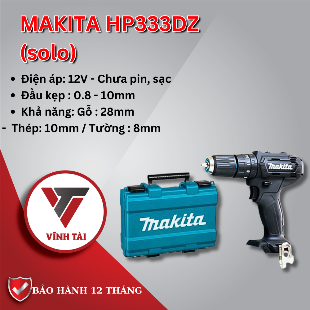 Máy khoan PIN 12V Makita HP333DZ (Thân máy) : Sử dụng pin Makita 12V, đem lại khả năng khoan tuyệt vời đối với một chiếc máy cầm tay cỡ nhỏ