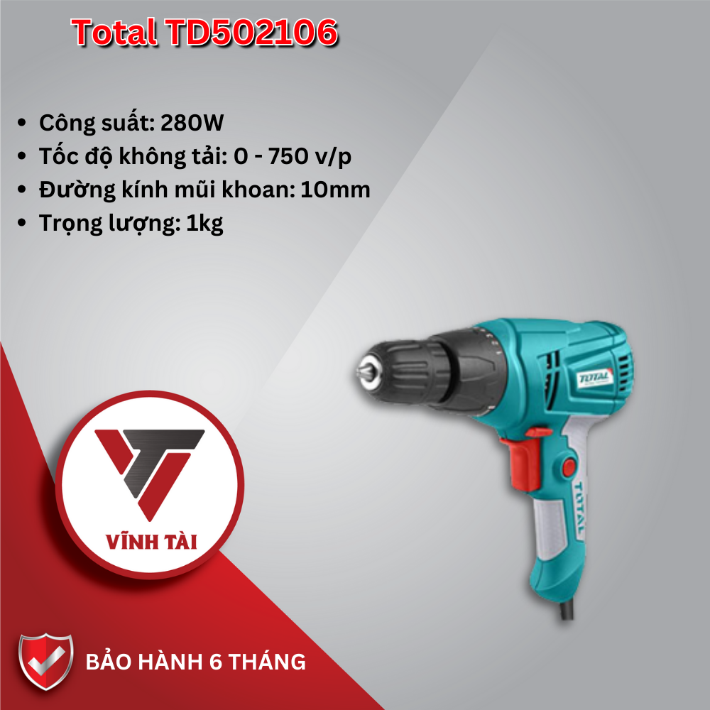 Tổng kết, máy khoan sắt Total TD502106 là một sản phẩm đáng tin cậy với hiệu suất hoạt động cao và thiết kế tiện lợi. Với giá cả phải chăng, đây là một lựa chọn tuyệt vời cho những người đam mê nghề và cần một sản phẩm đáng tin cậy để hoàn thành các nhiệm vụ khoan trên các bề mặt sắt.