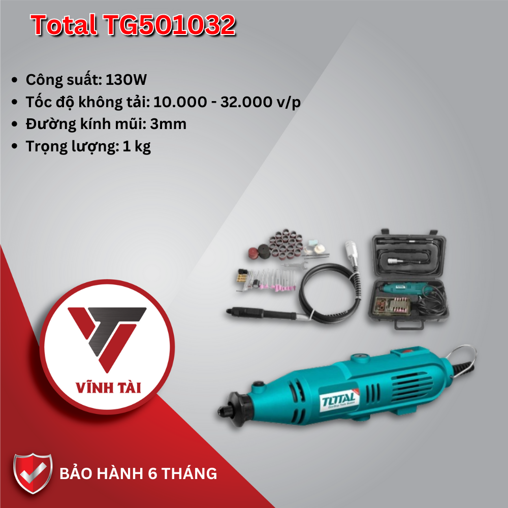 Máy mài khuôn Total TG501032: là đối tác hoàn hảo của một công cụ đa năng, mạnh mẽ và dễ sử dụng để hoàn thiện các dự án sáng tạo, giúp bạn thể hiện sự sáng tạo và tạo ra những tác phẩm tuyệt vời.