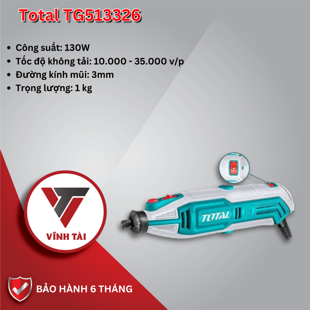 Máy mài khuôn Total TG513326: là đối tác hoàn hảo của một công cụ đa năng, mạnh mẽ và dễ sử dụng để hoàn thiện các dự án sáng tạo, giúp bạn thể hiện sự sáng tạo và tạo ra những tác phẩm tuyệt vời.