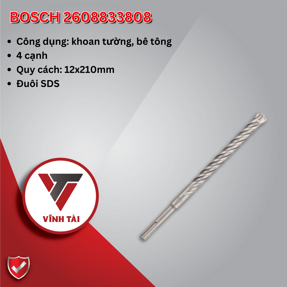 Mũi khoan SDS 12x110mm BOSCH Plus-5 2608833808 giúp công việc khoan tường, nhất là khi khoan lỗ để luồn dây lắp đặt, sửa chữa đường dây điện âm tường hoặc khoan đục để trang trí nhà cửa sẽ trở nên dễ dàng hơn bao giờ hết.