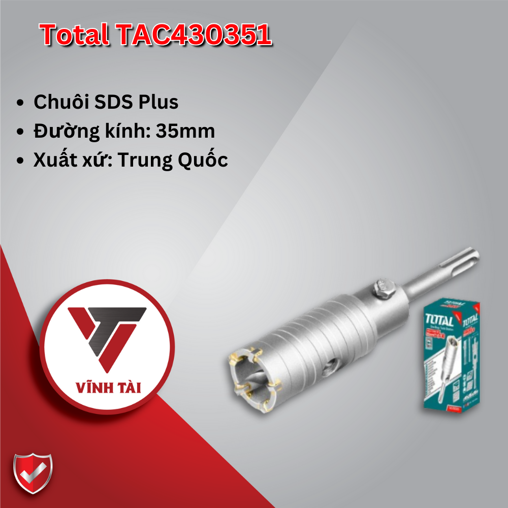 Mũi khoét tường 35mm Total TAC430351 được cấu tạo từ chất liệu hợp kim cao cấp, bền bỉ, có khả năng chịu va đập tốt và chịu được các điều kiện làm việc khắc nghiệt hứa hẹn sẽ mang đến nhiều trải nghiệm mới cho giới xây dựng và cơ khí.