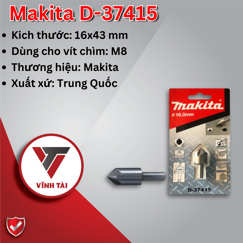 Mũi lã 16mm Makita D-37415: Thiết kế 5 lưỡi cắt bằng thép gió HSS , ứng dụng cho vít chìm M8, chuôi trụ tròn, dùng các vật liệu như: Gỗ, nhựa, kim loại màu, gang và thép.